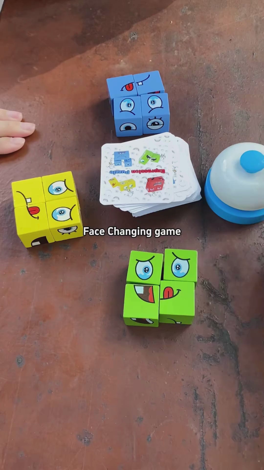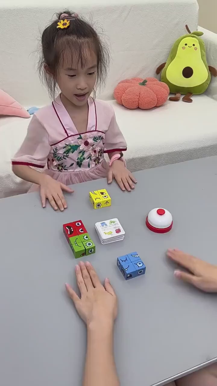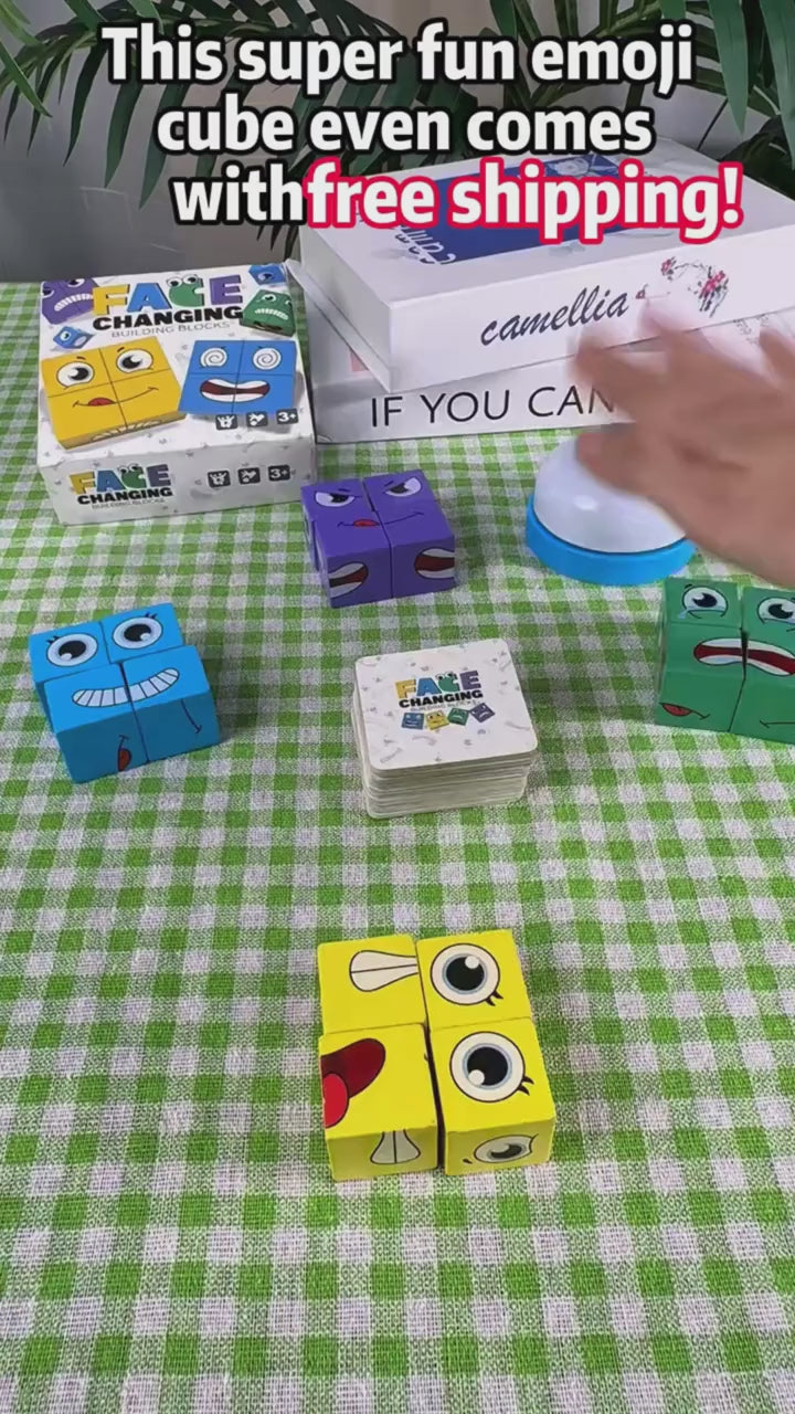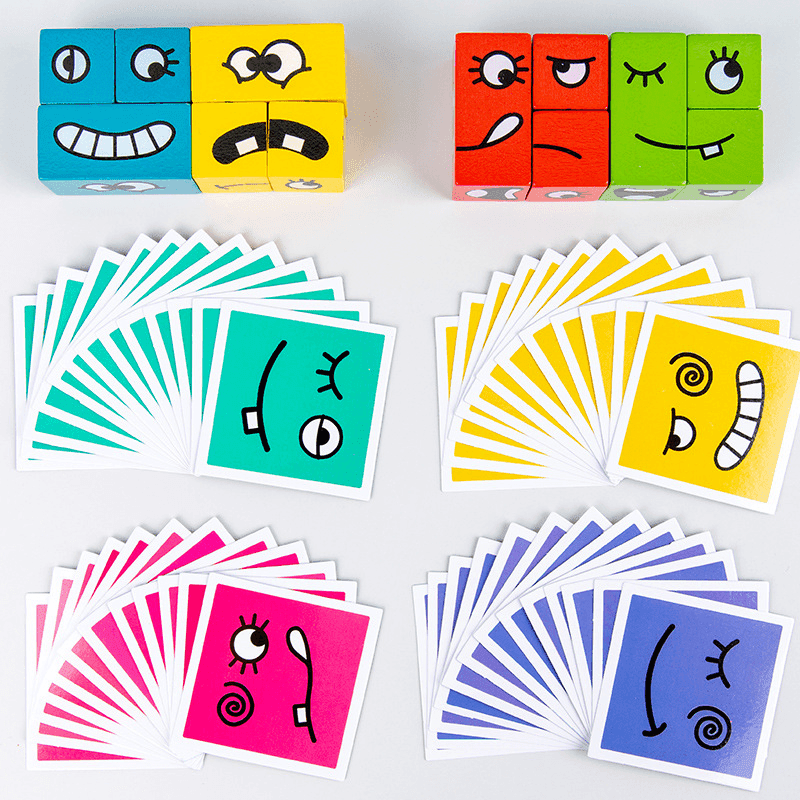 Fun Face-Matching Puzzle: A wooden cube game where kids recreate different facial expressions by arranging colorful blocks.